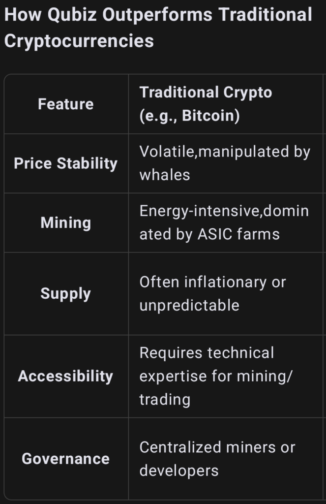 Qubiz (QUB) is a visionary cryptocurrency engineered to dismantle the inefficiencies and inequalities of traditional cryptocurrencies like Bitcoin and Ethereum. Designed as a direct response to the volatility, energy waste, and market manipulation plaguing the crypto space, Qubiz redefines digital finance with an unyielding focus on stability, fairness, and accessibility. Its mission? To render obsolete the outdated systems of proof-of-work mining, speculative price swings, and predatory "whale" behavior, replacing them with a sustainable, equitable, and future-proof ecosystem.
